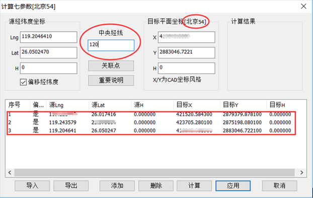 在開始計(jì)算7參數(shù)之前,請(qǐng)確認(rèn)你已獲知平面坐標(biāo)中的坐標(biāo)類型(北京54/西安80/國(guó)家2000),以及平面坐標(biāo)中所采用的中央經(jīng)線。
