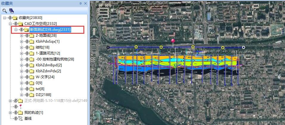 發(fā)送完成后,在奧維互動(dòng)地圖中,收藏夾會(huì)自動(dòng)創(chuàng)建一個(gè)以“CAD工作空間”命名的文件夾,地圖上會(huì)顯示發(fā)送過來的斷面圖。