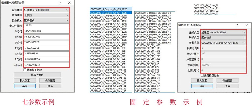 (2)轉(zhuǎn)換參數(shù):該參數(shù)為CAD文件的平面坐標(biāo)與經(jīng)緯度坐標(biāo)的轉(zhuǎn)化參數(shù),通常為七參數(shù)、四參數(shù)和固定參數(shù),您根據(jù)CAD文件的坐標(biāo)系參數(shù)進(jìn)行選擇,本文以七參數(shù)和固定參數(shù)為例。