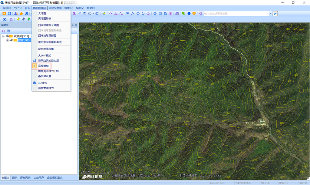 在奧維中,點(diǎn)擊[地圖切換],點(diǎn)擊【高程疊加】,縮放地圖,加載等高線。