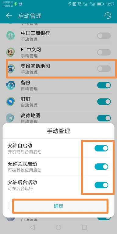 (1)若啟動管理里面顯示奧維互動地圖為“自動管理”,點(diǎn)擊關(guān)閉右側(cè)的藍(lán)色開關(guān),設(shè)置為手動管理,在彈出的面板中打開全部三個開關(guān)(允許自動啟動、允許關(guān)聯(lián)啟動、允許后臺活動),點(diǎn)擊【確定】按鈕。