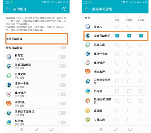 (2)若用戶的設(shè)置里面奧維互動地圖已為“手動管理”,請點(diǎn)擊【批量手動管理】,查看【自啟動】【關(guān)聯(lián)啟動】【后臺活動】是否全部勾選,若沒有,請全部勾選。