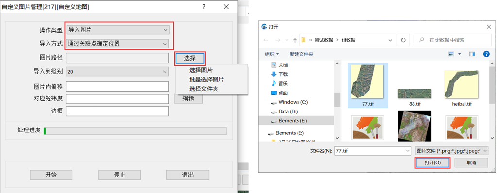 在【自定義地圖管理[217][自定義地圖]】窗口中,點(diǎn)擊【操作類型】下拉框,選擇【導(dǎo)入圖片】,點(diǎn)擊【導(dǎo)入方式】下拉框,選擇【通過關(guān)聯(lián)點(diǎn)確定位置】,點(diǎn)擊【圖片路徑】欄右側(cè)的【選擇】按鈕→【選擇圖片】,選擇航拍圖,點(diǎn)擊打開。