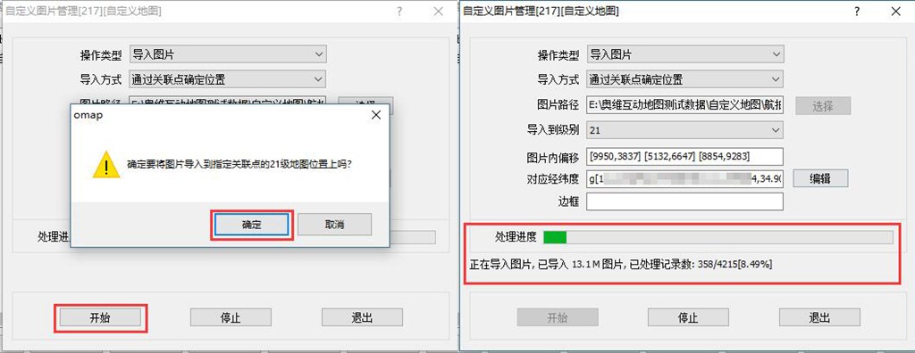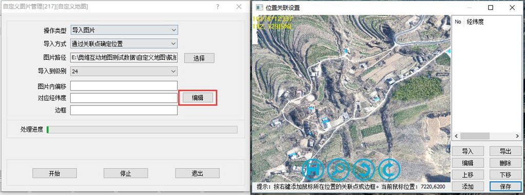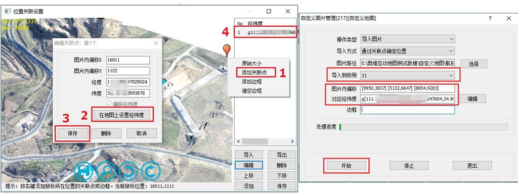 添加完關(guān)聯(lián)點(diǎn)后,在【位置關(guān)聯(lián)】設(shè)置窗口中,點(diǎn)擊【保存】按鈕,保存關(guān)聯(lián)點(diǎn)。在【自定義地圖管理[217][自定義地圖]】窗口中,設(shè)置導(dǎo)入到級(jí)別,點(diǎn)擊【開始】按鈕,執(zhí)行導(dǎo)入。