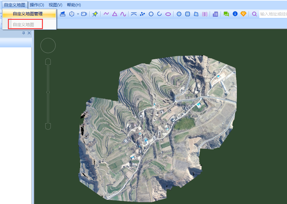 10、生成低級(jí)別圖片完成后,點(diǎn)擊【自定義地圖】菜單,選擇剛添加的圖層【自定義地圖】,可將地圖切換到新添加的地圖圖層,能夠正常顯示該地圖。