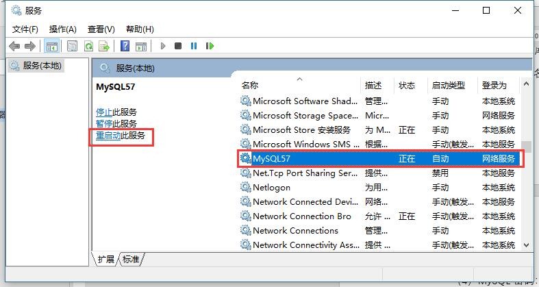 打開(kāi)控制面板——管理工具——服務(wù),選中MySQL57,點(diǎn)擊【重啟動(dòng)】,即可。