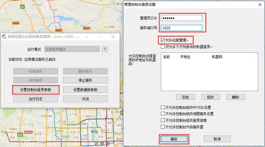 點(diǎn)擊【設(shè)置控制臺(tái)登錄參數(shù)】按鈕,進(jìn)入【管理控制臺(tái)登錄設(shè)置】窗口,設(shè)置管理員口令、端口號(hào),勾選【允許遠(yuǎn)程管理】等,點(diǎn)擊【確定】按鈕,點(diǎn)擊【停止服務(wù)】按鈕,停止服務(wù),點(diǎn)擊【啟動(dòng)服務(wù)】按鈕,重新啟動(dòng)奧維應(yīng)用模式服務(wù)。