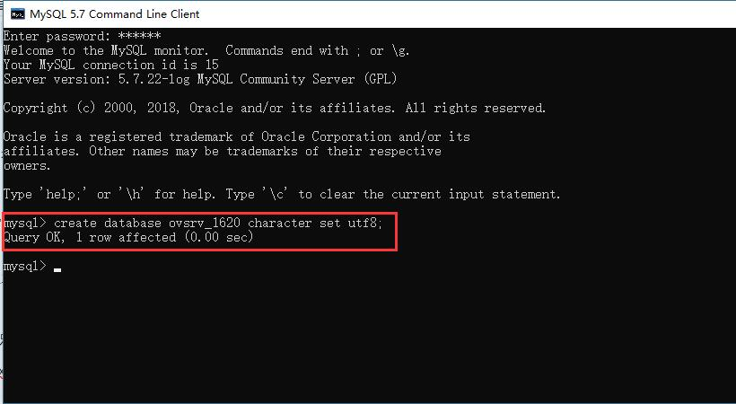 啟動(dòng)MySQL 5.7 Command Line Client,登錄數(shù)據(jù)庫(kù),創(chuàng)建新數(shù)據(jù)庫(kù),此處以創(chuàng)建ovsrv_1620數(shù)據(jù)庫(kù)為例。