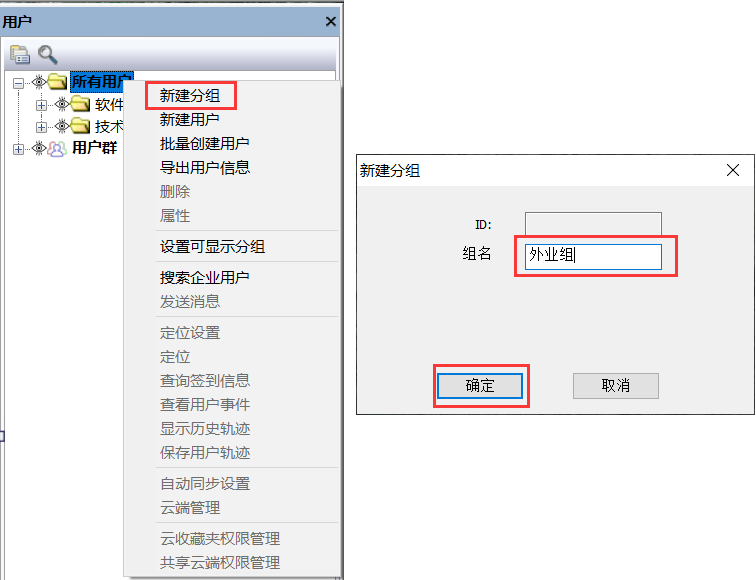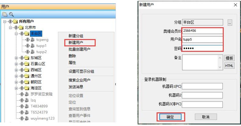 選中剛新建的分組,點(diǎn)擊鼠標(biāo)【右鍵】,點(diǎn)擊【新建用戶】,進(jìn)入【新建用戶】窗口,輸入企業(yè)會員ID、用戶名、密碼,點(diǎn)擊【確定】按鈕。