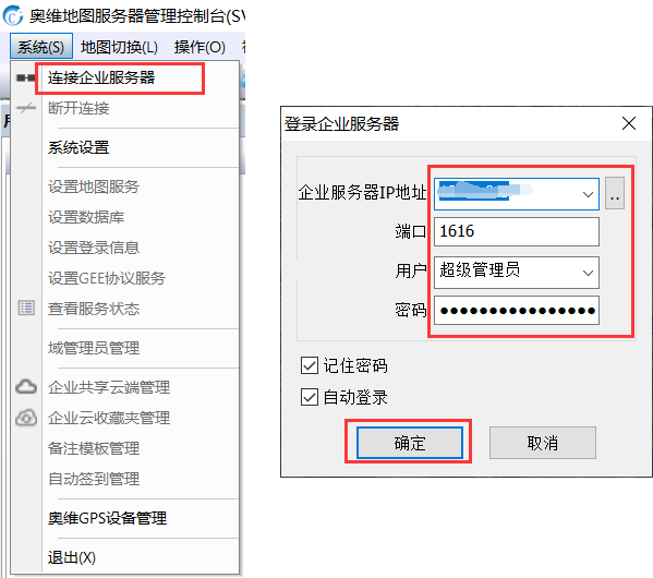 在控制臺中,點(diǎn)擊【系統(tǒng)】下拉菜單,點(diǎn)擊【連接企業(yè)服務(wù)器】,進(jìn)入【登錄企業(yè)服務(wù)器】窗口,輸入服務(wù)器所在機(jī)器的IP地址、端口、密碼,點(diǎn)擊【確定】按鈕。