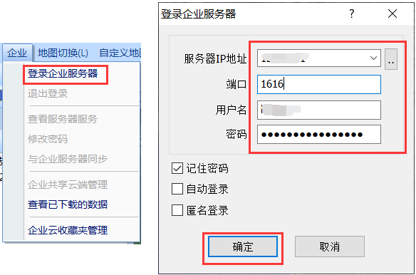 在奧維客戶端中,點(diǎn)擊【企業(yè)】下拉菜單,點(diǎn)擊【登錄企業(yè)服務(wù)器】,進(jìn)入【登錄企業(yè)服務(wù)器】窗口,輸入服務(wù)器IP地址、端口、用戶名、密碼,點(diǎn)擊【確定】按鈕。
