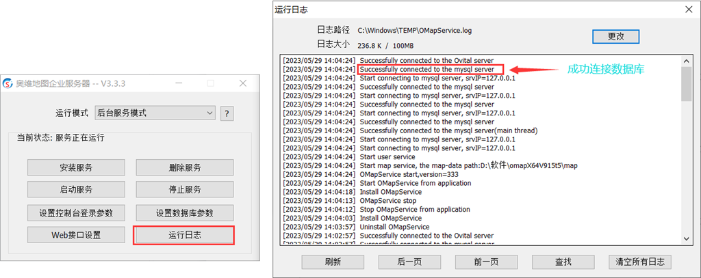 在【奧維地圖企業(yè)服務(wù)器】窗口中,點(diǎn)擊【運(yùn)行日志】按鈕,進(jìn)入【運(yùn)行日志】窗口,可查看企業(yè)服務(wù)器運(yùn)行日志,如數(shù)據(jù)庫連接狀態(tài)、服務(wù)狀態(tài)等。