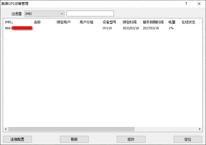 在顯示的奧維GPS定位設(shè)備列表中,顯示設(shè)備的IMEI編號(hào)、名稱(設(shè)置名稱后才會(huì)顯示)、綁定用戶(綁定后才會(huì)顯示)、設(shè)備型號(hào)、綁定時(shí)間、服務(wù)到期時(shí)間、電量、在線狀態(tài)、最后連接時(shí)間、最后定位時(shí)間、經(jīng)緯度等信息。