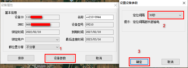 在【設(shè)備屬性】窗口中,點(diǎn)擊【設(shè)備參數(shù)】按鈕,彈出【設(shè)置設(shè)備參數(shù)】窗口,可對(duì)設(shè)備的定位間隔進(jìn)行設(shè)置。