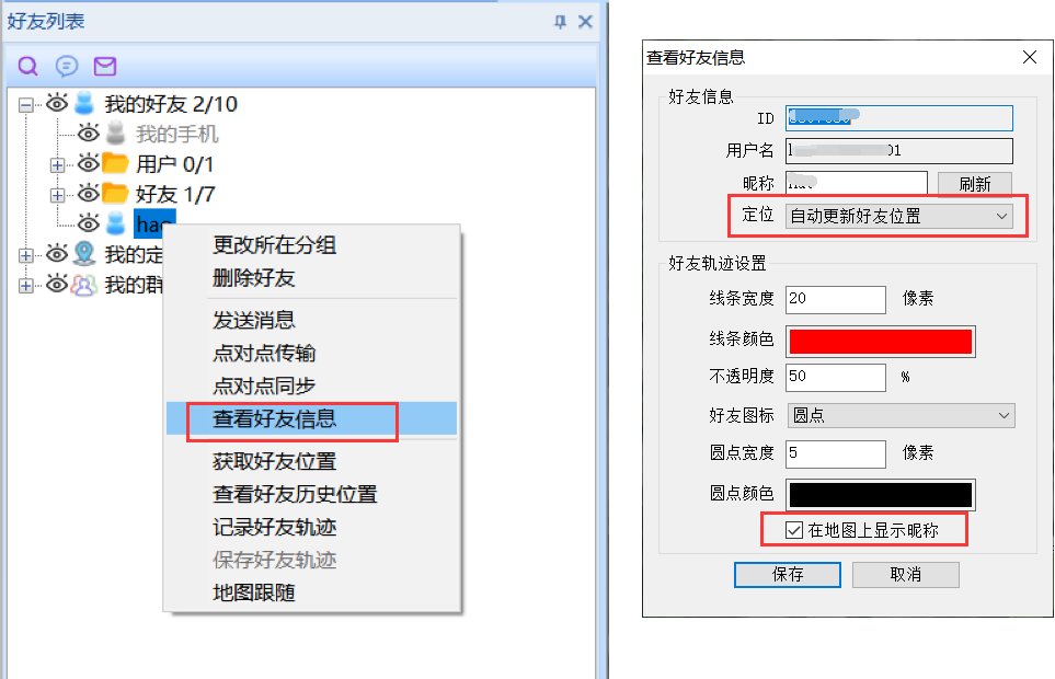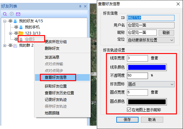 在[好友列表]窗口中,選中好友,點(diǎn)擊【右鍵】,點(diǎn)擊【查看好友信息】按鈕,進(jìn)入[查看好友信息]窗口,在【好友軌跡設(shè)置】欄中,可對線條顏色、線條寬度、不透明度、好友圖標(biāo)、顯示昵稱等進(jìn)行設(shè)置。