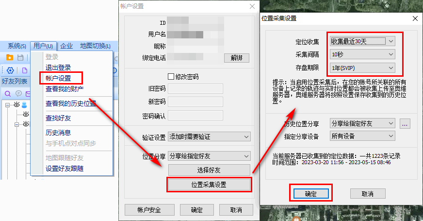 登錄賬戶后,在[好友]頁面,點(diǎn)擊【設(shè)置】,點(diǎn)擊【位置采集設(shè)置】,設(shè)置定位收集、采集間隔、存盤期限等。