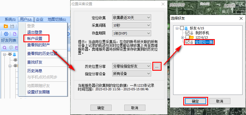 在奧維PC客戶端中,點(diǎn)擊[用戶]菜單,點(diǎn)擊【賬戶設(shè)置】按鈕,進(jìn)入[賬戶設(shè)置]窗口,點(diǎn)擊【位置分享】下拉框,選擇【分享給指定好友】,點(diǎn)擊【選擇好友】按鈕,彈出[選擇好友]窗口,勾選好友,點(diǎn)擊【確定】按鈕,執(zhí)行分享。設(shè)置完后,指定的好友即能獲取本客戶端的位置信息。
