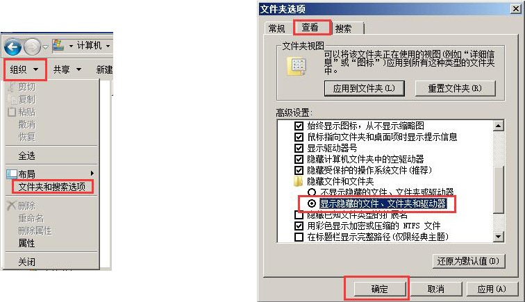 進入到C盤,點擊【組織】—>【文件夾和搜索選項】—>【查看】,在[隱藏文件和文件夾]中,選擇【顯示隱藏的文件、文件夾】,點擊【確定】。