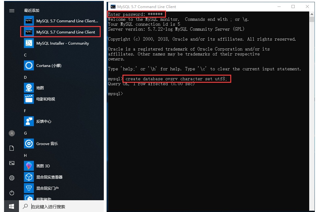 (2)創(chuàng)建ovsrv數據庫,執(zhí)行命令:create database ovsrv character set utf8;