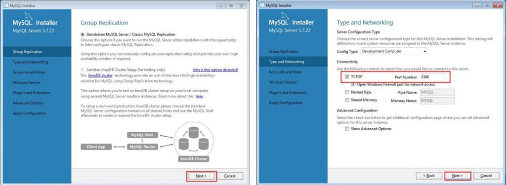 (5)配置Group Replication(組復制),保持默認設置即可,點擊【Next(下一步)】按鈕;配置Type and Networking(類型與組網),保持默認設置即可,點擊【Next(下一步)】按鈕。