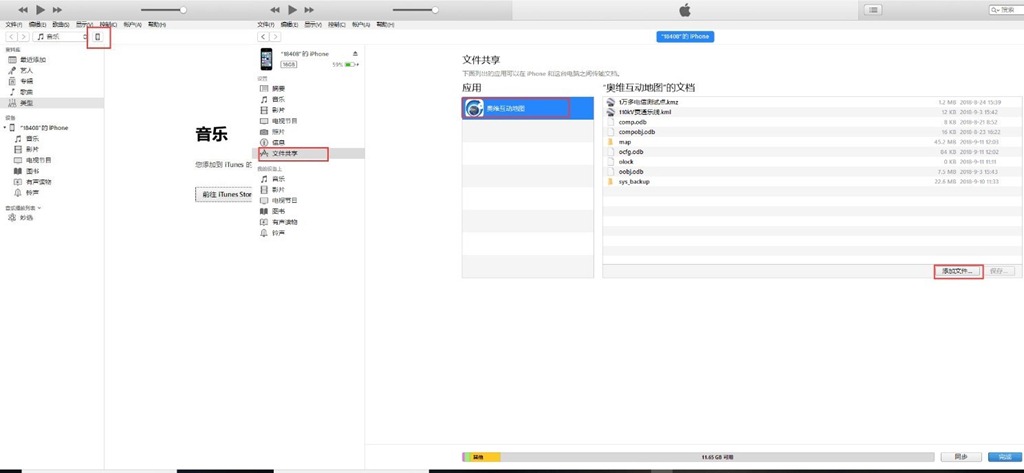 蘋果用則需要通過iTunes將數(shù)據(jù)放到奧維根目錄下,如下圖所示。連接手機后,點擊【共享文件】,找到奧維互動地圖,點擊【添加文件】,將文件添加到奧維互動地圖的目錄下即可。