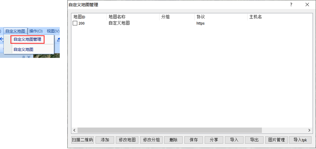 在奧維PC端中,點擊[自定義地圖]菜單,點擊【自定義地圖管理】,進入[自定義地圖管理]窗口。