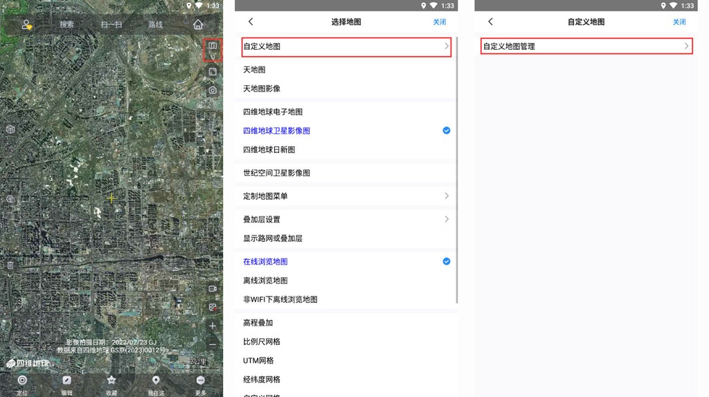 啟動奧維Android/iOS版,點擊主界面右上角的圖片1按鈕,點擊【自定義地圖】,點擊【自定義地圖管理】,進入[自定義地圖管理]頁面。