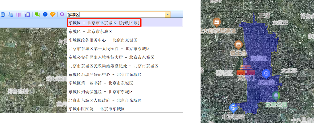 在搜索框中,輸入縣級行政區(qū)域名(如東城區(qū)),選擇含“行政區(qū)域”的條目,即可搜索出縣級行政區(qū)域并顯示在地圖上。