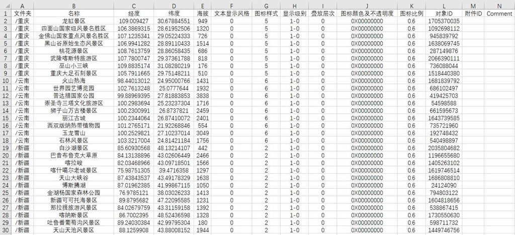 要將表格中的經(jīng)緯度坐標(biāo)數(shù)據(jù)導(dǎo)入到奧維中來(lái),其字段排列順序必須按照奧維規(guī)定的格式進(jìn)行設(shè)置。奧維CSV格式數(shù)據(jù)模板如下: