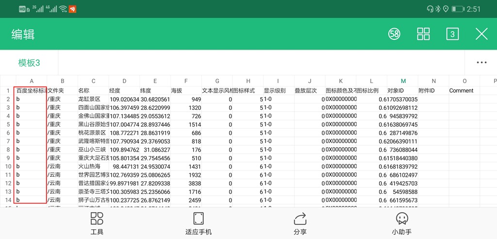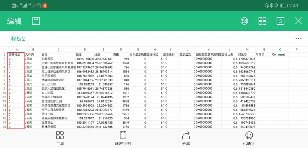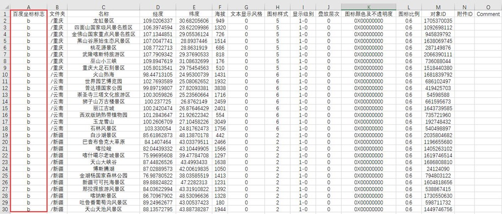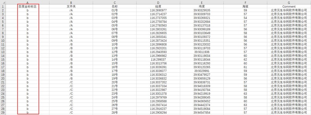 若數(shù)據(jù)的經(jīng)緯度坐標(biāo)為GCJ -02坐標(biāo)(GCJ -02經(jīng)緯度)或者BD -09坐標(biāo)(百度坐標(biāo)),則需要在表格的第一列加上偏移標(biāo)志,GCJ -02坐標(biāo)為“g”,BD -09坐標(biāo)為“b”。
