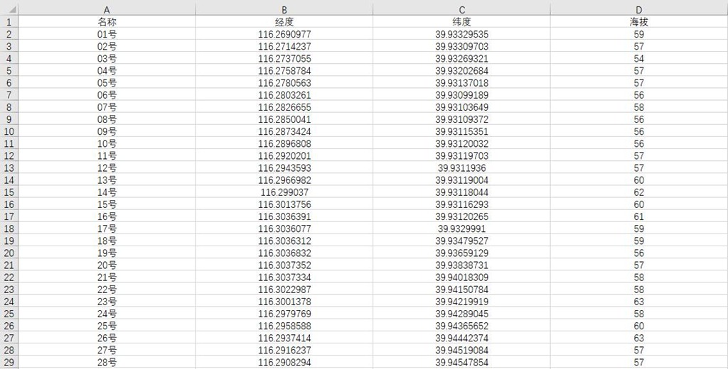 若用戶的經(jīng)緯度坐標(biāo)為CGCS2000地理坐標(biāo),且只有名稱、經(jīng)度、緯度、海拔這幾個(gè)字段,那么排列順序就為名稱、經(jīng)度、緯度、海拔。如下圖所示: