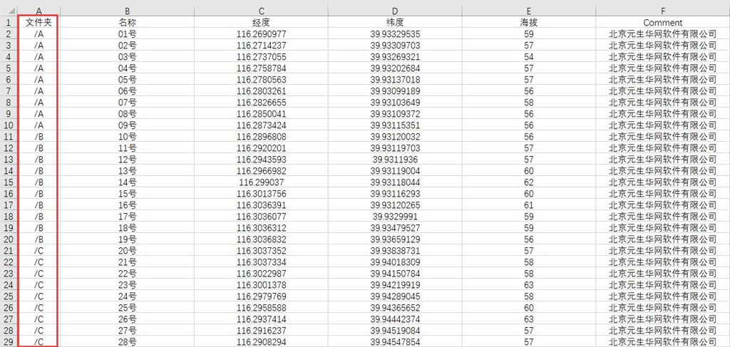 要將表格中的坐標(biāo)數(shù)據(jù)導(dǎo)入到奧維中來(lái),其字段排列順序必須按照奧維規(guī)定的格式進(jìn)行設(shè)置。奧維CSV格式數(shù)據(jù)模板如下:
