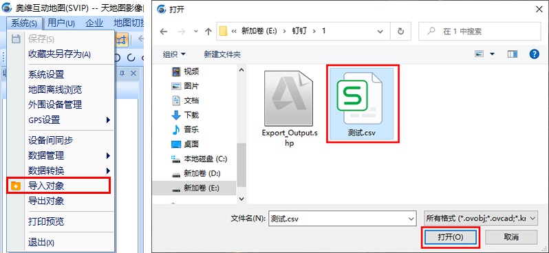 在奧維中點(diǎn)擊[系統(tǒng)]菜單,點(diǎn)擊【導(dǎo)入對(duì)象】,選擇需要導(dǎo)入的文件,點(diǎn)擊【打開(kāi)】。