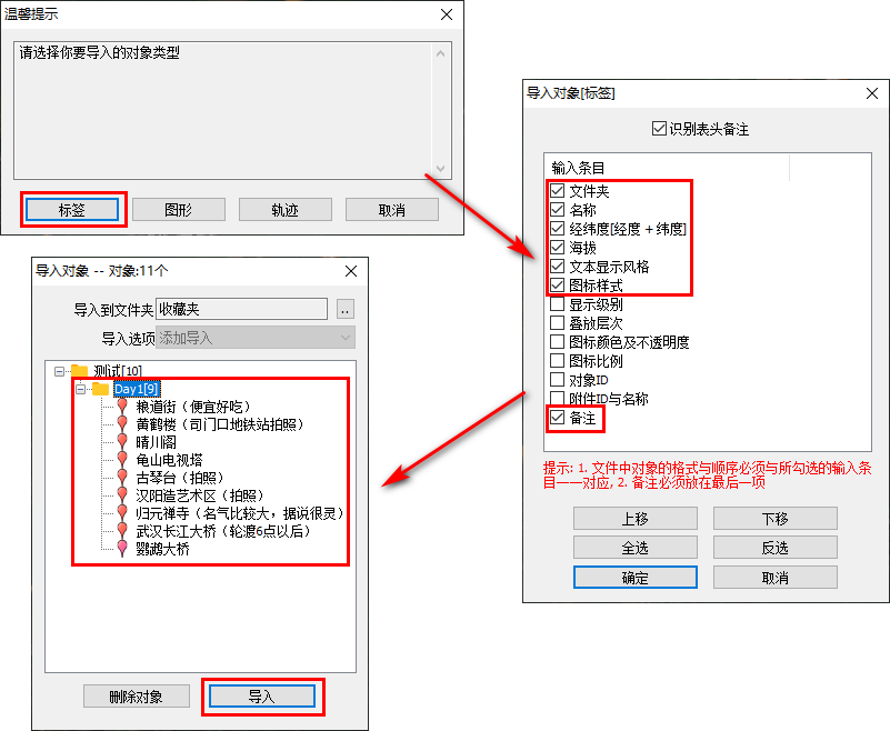 ★注意:數(shù)據(jù)文件中有什么屬性字段,就勾選什么;我們的坐標(biāo)文件中有文件夾、名稱、經(jīng)度、緯度、海拔、Comment,那么就勾選文件夾、名稱、經(jīng)緯度[經(jīng)度+緯度]、海拔、備注。