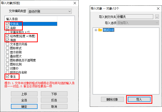 ☆說明:數(shù)據(jù)文件中有什么屬性字段,就勾選什么;我們的坐標(biāo)文件中有文件夾、名稱、經(jīng)度、緯度、海拔以及三個(gè)備注屬性,那么就勾選文件夾、名稱、經(jīng)緯度、海拔、備注。