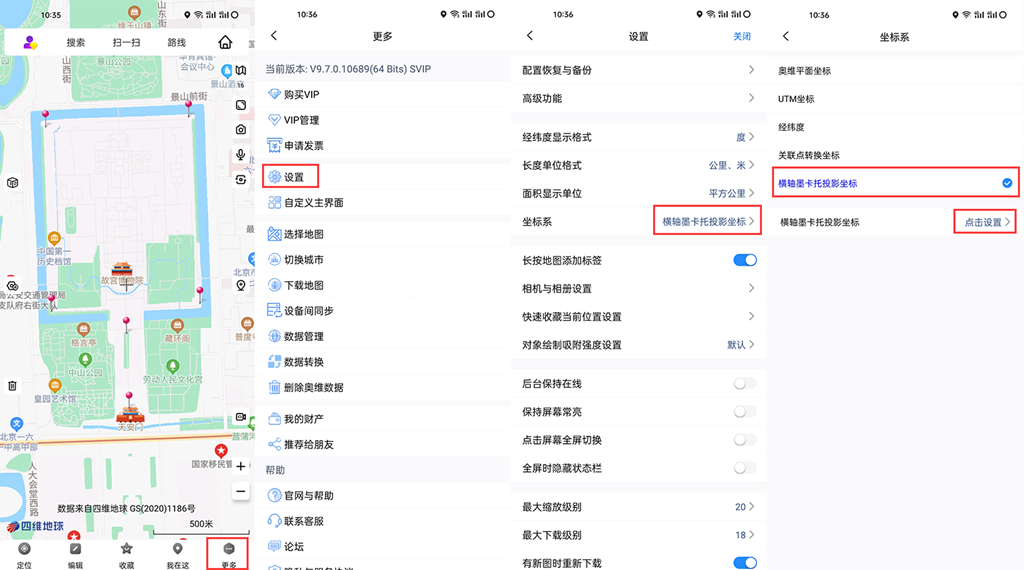在手機端主界面,點擊【更多】,點擊【設(shè)置】,點擊【坐標系】,選擇【橫軸墨卡托投影坐標】,點擊設(shè)置,進入[橫軸墨卡托投影坐標]頁面。