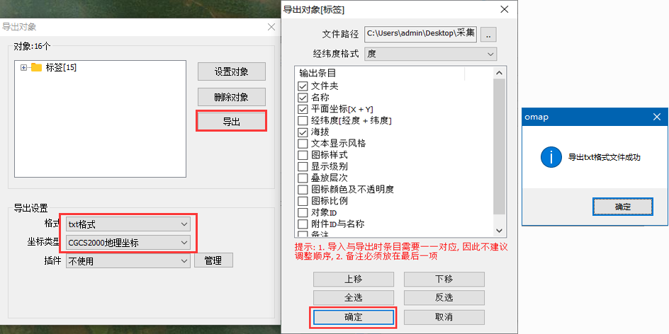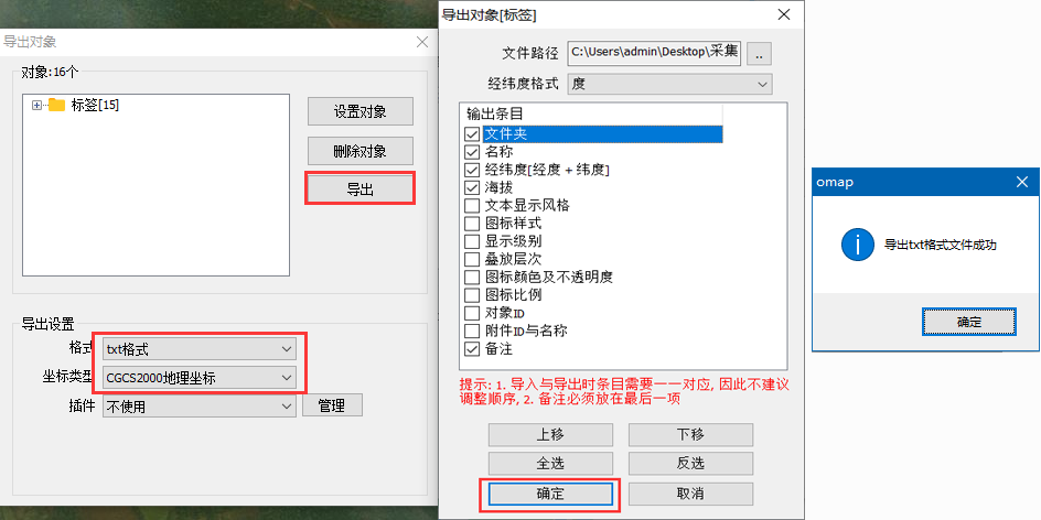 輸出條目:用戶可根據(jù)實際需要選擇需要輸出的屬性條目,本教程以導(dǎo)出文件夾、名稱、平面坐標、海拔、備注為例。