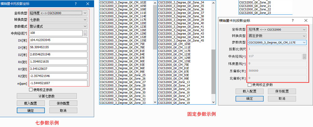 關(guān)于參數(shù)的說明請參考本文《1.2.1設(shè)置系統(tǒng)坐標系》,這里不以贅述。七參數(shù)和固定參數(shù)的設(shè)置示例如下圖所示。