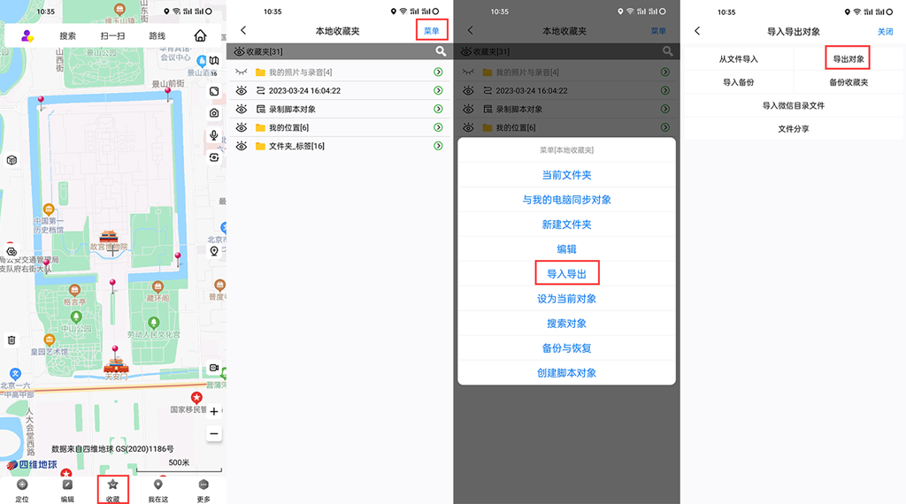 在手機端主界面,點擊【收藏】,點擊【菜單】,點擊【導(dǎo)入導(dǎo)出】,點擊【導(dǎo)出對象】,進入[選擇對象]頁面。