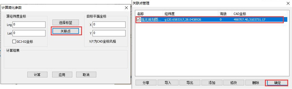 ☆若用戶已將關(guān)聯(lián)點(diǎn)保存在了[關(guān)聯(lián)點(diǎn)管理]中,那么可點(diǎn)擊【關(guān)聯(lián)點(diǎn)】,勾選關(guān)聯(lián)點(diǎn),點(diǎn)擊【確定】,系統(tǒng)會(huì)自動(dòng)獲取源經(jīng)緯度坐標(biāo)和目標(biāo)平面坐標(biāo)。