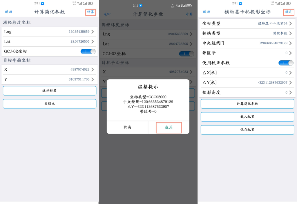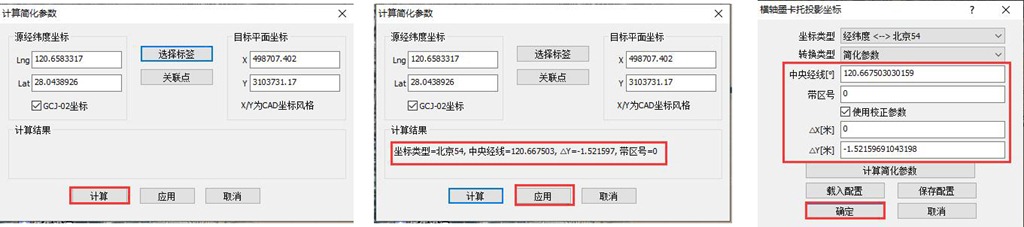對(duì)于簡(jiǎn)化參數(shù),用戶不必關(guān)注計(jì)算出來(lái)的坐標(biāo)類型、中央經(jīng)線、△Y以及帶區(qū)號(hào),這些參數(shù)是系統(tǒng)自動(dòng)按照最小誤差確定的,沒(méi)有實(shí)際意義。
