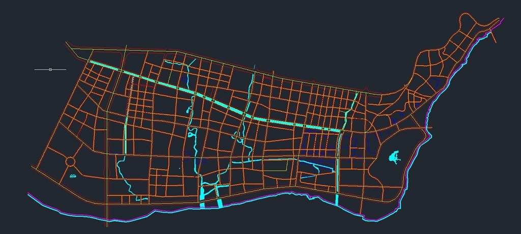 打開(kāi)CAD文件,在圖紙中找到一個(gè)特征明顯的點(diǎn),如交叉路口,地物拐角,這樣便于用戶在地圖上準(zhǔn)確的找到具體位置。如下圖所示,箭頭所指的道路交叉點(diǎn)。