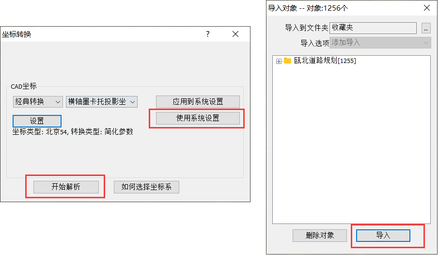 進(jìn)入[坐標(biāo)轉(zhuǎn)換]窗口,由于之前我們已經(jīng)設(shè)置好了系統(tǒng)坐標(biāo)系,因此這里我們可以直接點(diǎn)擊【使用系統(tǒng)設(shè)置】,點(diǎn)擊【開(kāi)始解析】,系統(tǒng)解析文件;點(diǎn)擊【導(dǎo)入】,系統(tǒng)執(zhí)行導(dǎo)入。