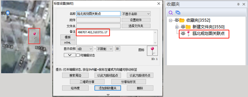 然后在奧維中找到對(duì)應(yīng)的點(diǎn),在該點(diǎn)處創(chuàng)建標(biāo)簽,將該點(diǎn)的CAD坐標(biāo)填寫(xiě)在備注欄目下面(只需要填寫(xiě)X和Y,不需要高程),輸入名稱,并【添加到收藏夾】。