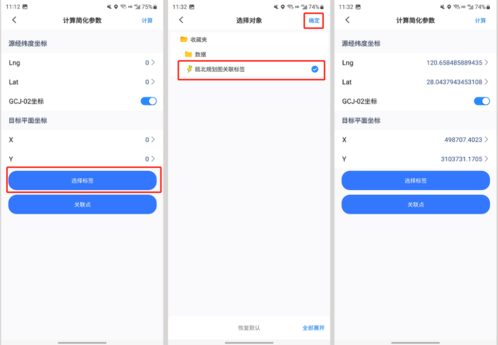 ☆若用戶想通過(guò)關(guān)聯(lián)點(diǎn)計(jì)算簡(jiǎn)化參數(shù),且關(guān)聯(lián)點(diǎn)保存在收藏夾中,那么點(diǎn)擊【選擇標(biāo)簽】,選擇關(guān)聯(lián)點(diǎn)標(biāo)簽,點(diǎn)擊【確定】,系統(tǒng)會(huì)自動(dòng)獲取源經(jīng)緯度坐標(biāo)和目標(biāo)平面坐標(biāo)。