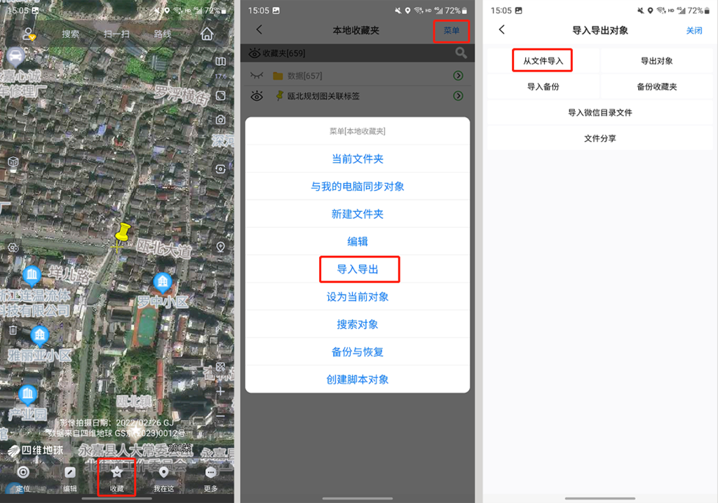 在奧維手機(jī)端,點(diǎn)擊【收藏】→【菜單】→【導(dǎo)入導(dǎo)出】→【從文件導(dǎo)入】。