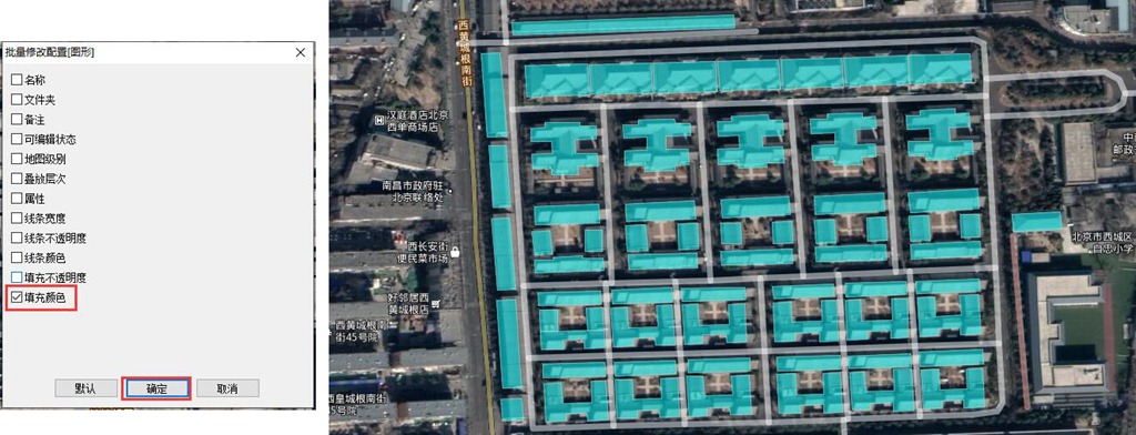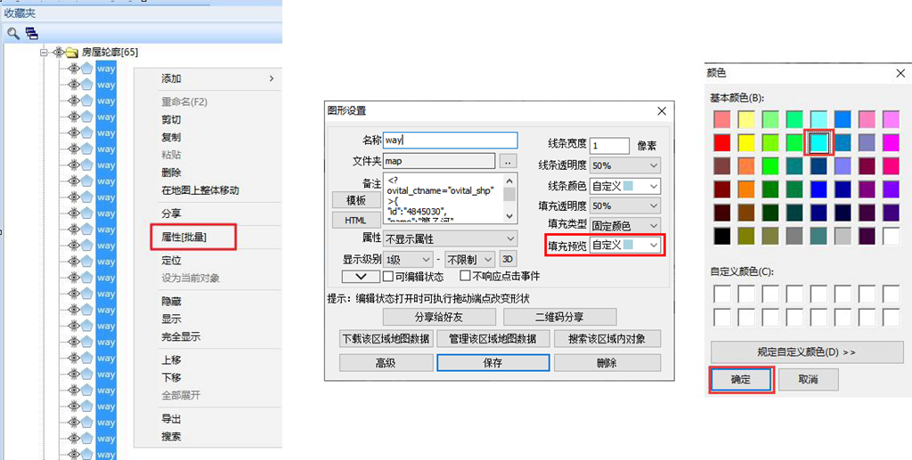 在奧維中,用戶可對數(shù)據(jù)的屬性進行批量修改,如標簽的圖標、軌跡的線條顏色和寬度、圖形的填充顏色和不透明度等。本文以修改圖形的填充顏色為例,其他屬性的批量修改操作一致。