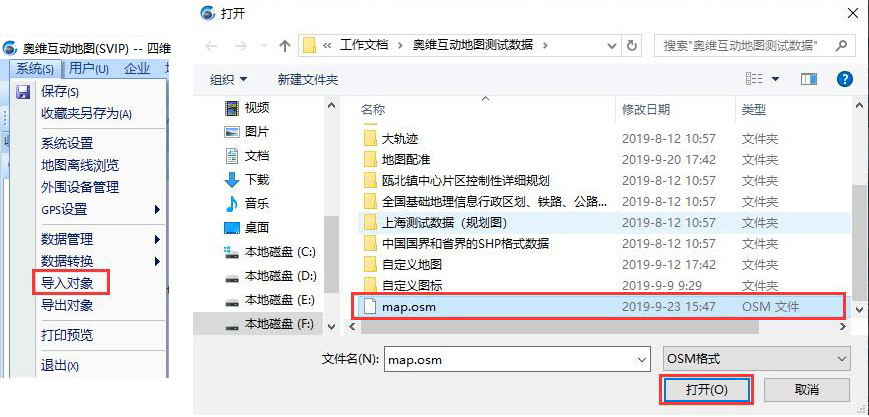 在奧維中,點擊[系統(tǒng)]菜單,點擊【導入】按鈕,選中需要導入的OSM文件,點擊【打開】。
