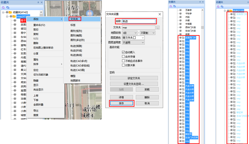 導入OSM數(shù)據(jù),通常類型較多(包括軌跡、圖形、標簽),導入后的初始狀態(tài)是混合存放在同一個文件夾下的,不太方便使用。我們可以按照奧維對象的類型存放數(shù)據(jù),即標簽、軌跡、圖形各存放一個文件夾,如下圖所示。