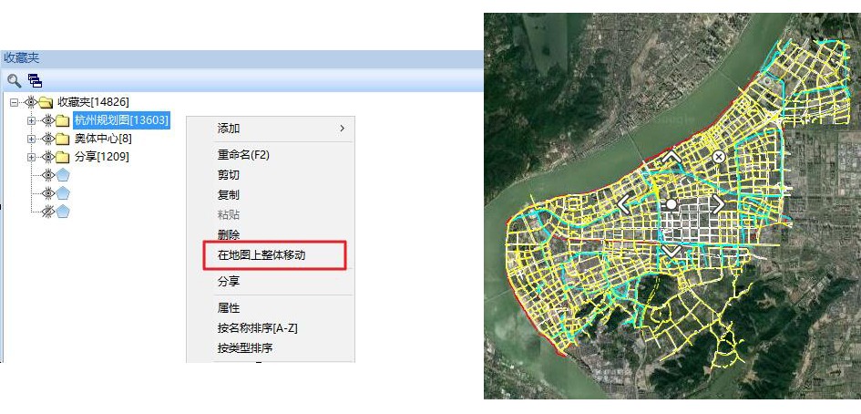 在收藏夾中選中所有數(shù)據(jù)(也可以選擇文件夾),點(diǎn)擊鼠標(biāo)右鍵,點(diǎn)擊【在地圖上整體移動(dòng)】,在地圖上會(huì)出現(xiàn)“上下左右”方向按鈕。